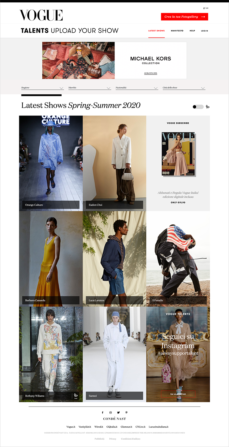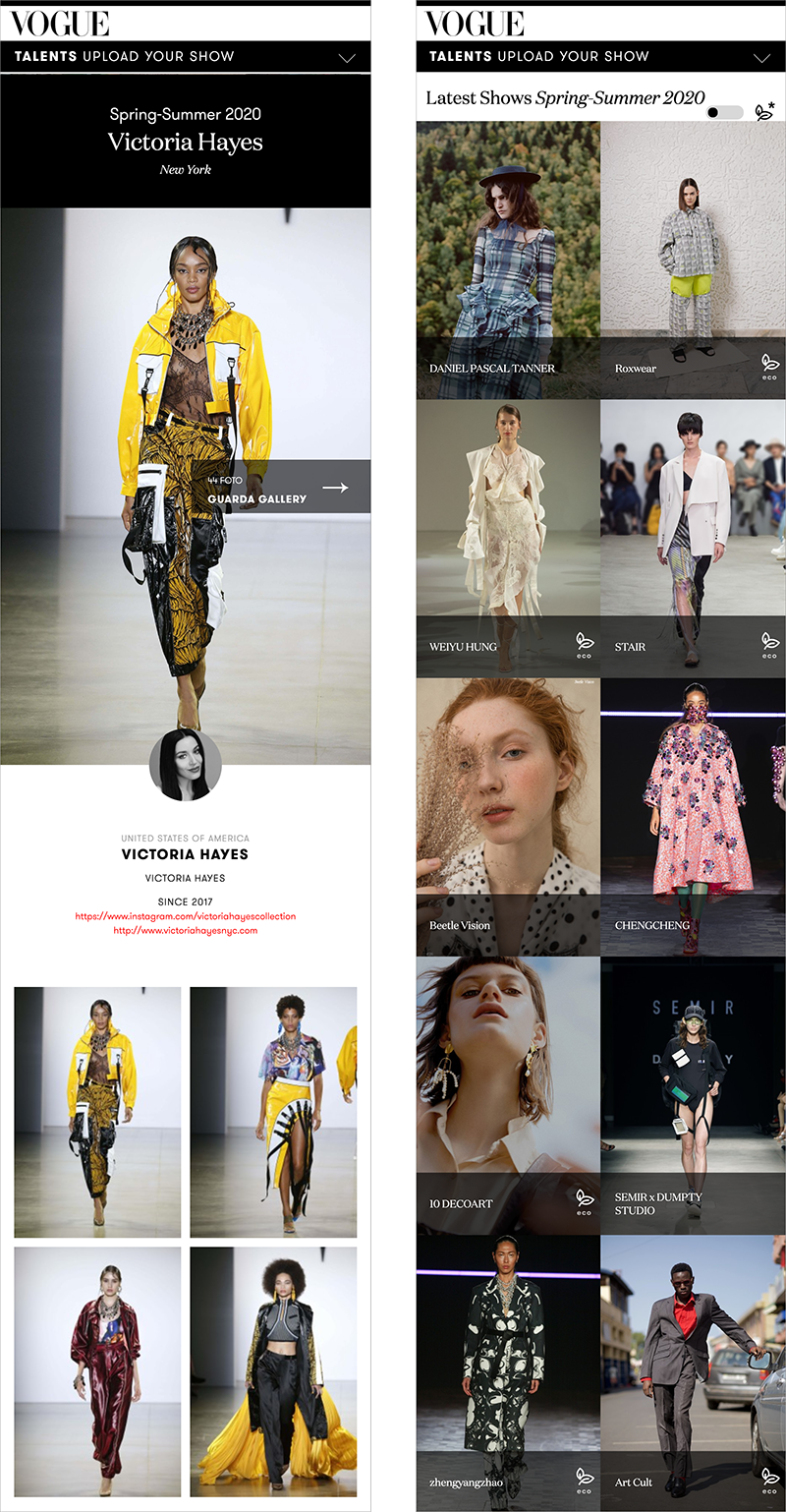 Upload Your Show è una sezione di Vogue.it ed è disegnata coerentemente con il family feeling di VOGUE International e nel rispetto delle specifiche necessità della User Experience.