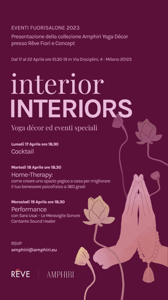 Vengono ben descritti sia la collezione che Amphiri presenterà a Milano da Rêve Fiori e Concept in occasione del Fuorisalone 2023, che gli eventi interior interiors, yoga décor e performance sonore, pensati da Rachel con due professioniste del settore e organizzati dal 17 al 22 Aprile 2023.
