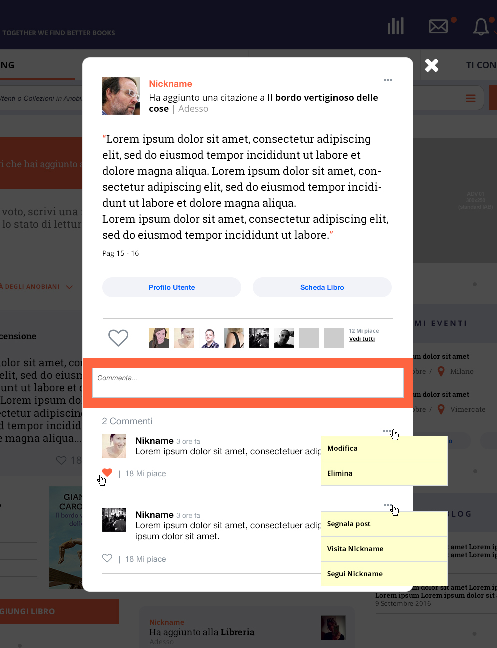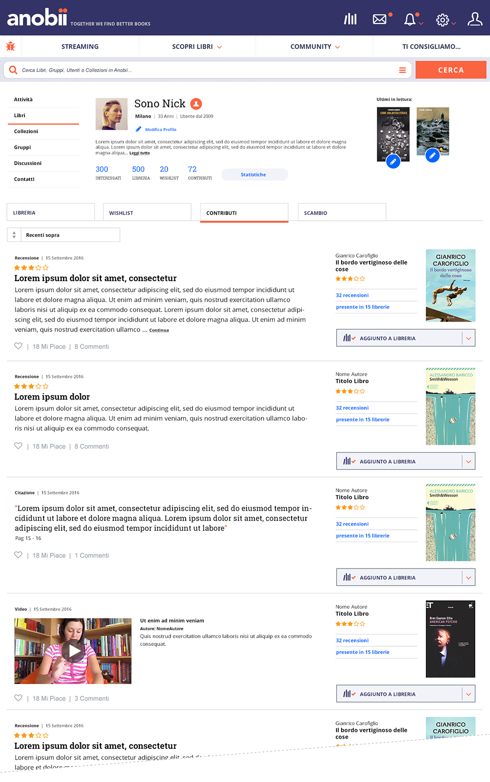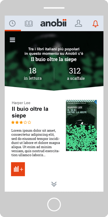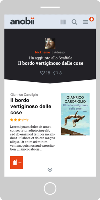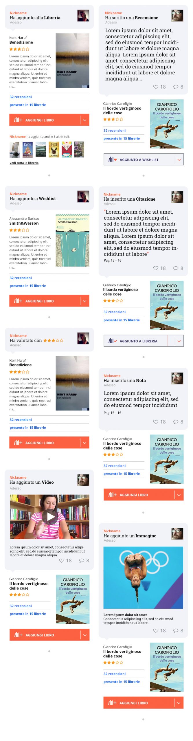 VENGONO VALORIZZATE ED AGGIUNTE AI FEED STREAMING TUTTE LE ATTIVITÀ DEGLI UTENTI. LA STRUTTURA MODULARE DELLE ANTEPRIME ASSOCIA UNA PARTE DEDICATA ALL’ATTIVITÀ AD UNA BREVE SCHEDA DEL LIBRO E IL PULSANTE PER AGGIUNGERLO SUBITO ALLE LISTE.