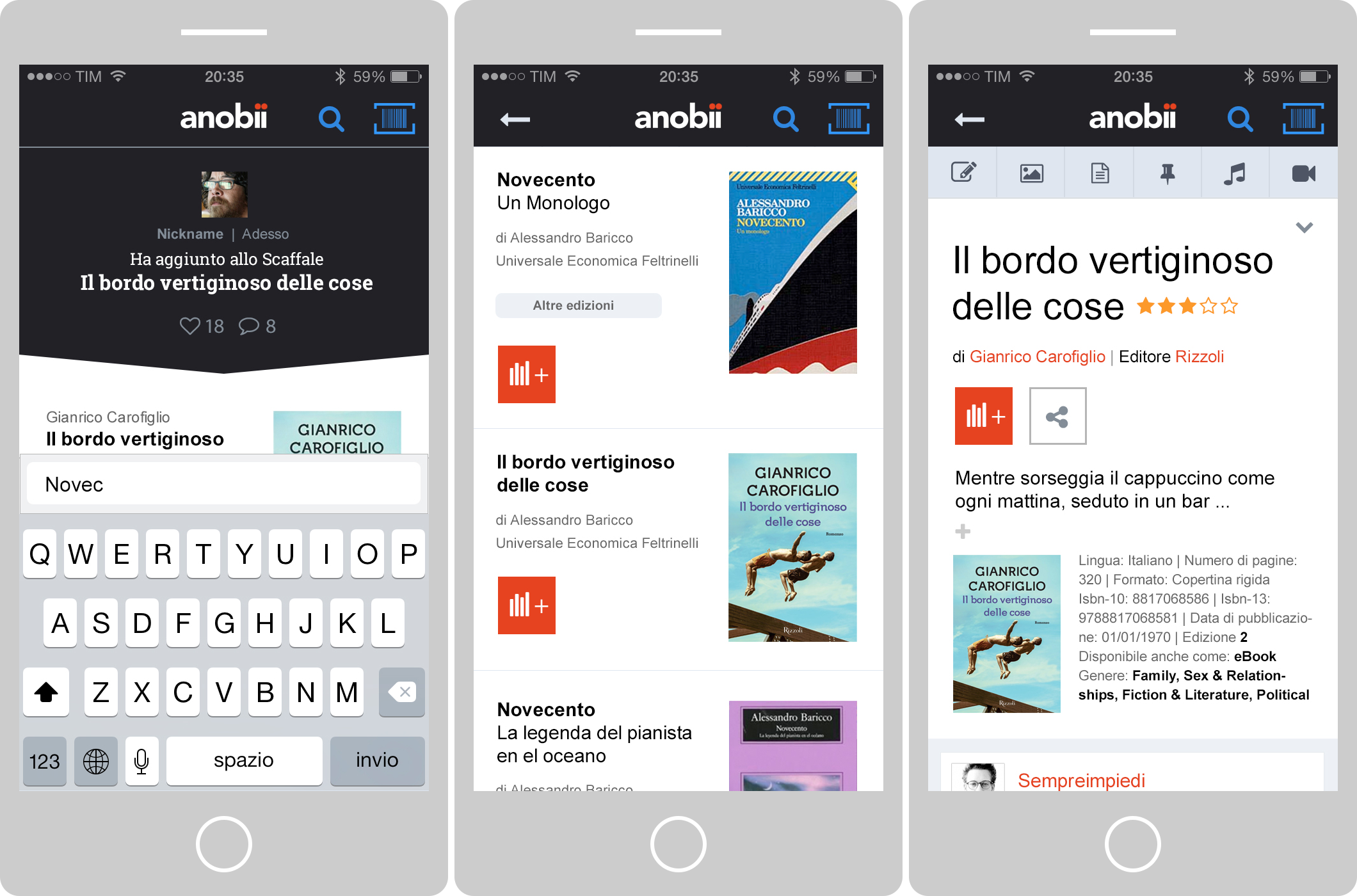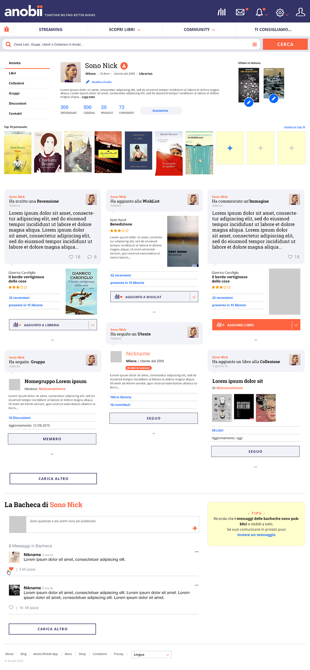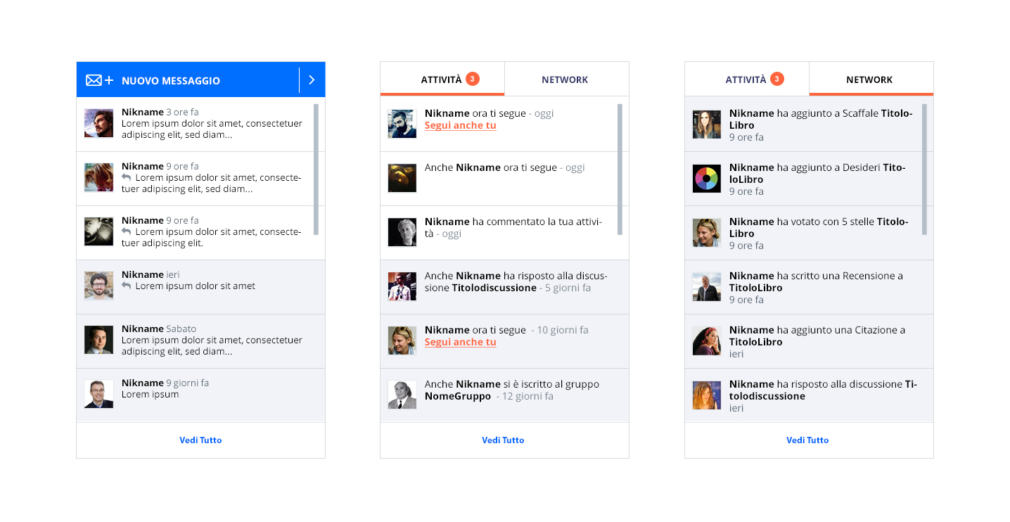 VENGONO VALORIZZATE ED AGGIUNTE AI FEED STREAMING TUTTE LE ATTIVITÀ DEGLI UTENTI. LA STRUTTURA MODULARE DELLE ANTEPRIME ASSOCIA UNA PARTE DEDICATA ALL’ATTIVITÀ AD UNA BREVE SCHEDA DEL LIBRO E IL PULSANTE PER AGGIUNGERLO SUBITO ALLE LISTE.
