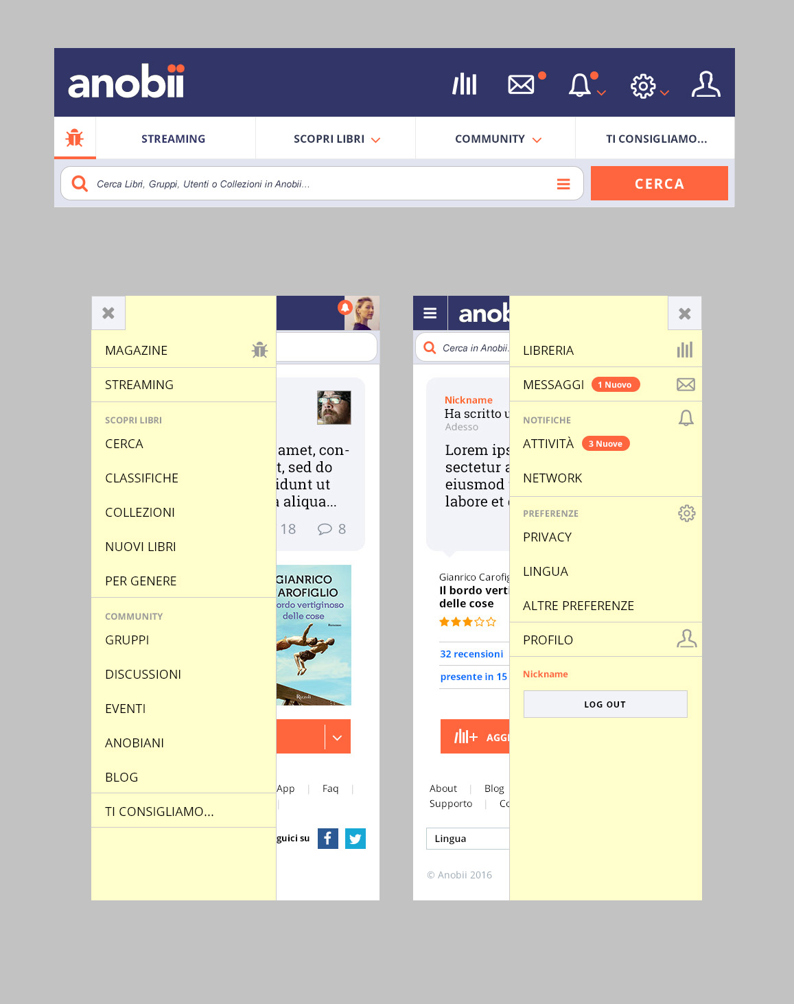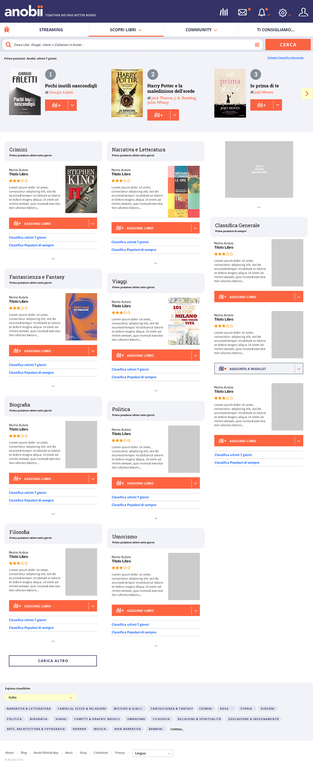 Sotto: Studio dei contenuti di navigazione nelle versioni responsive; Discovery contenuti attraverso layout classifiche
