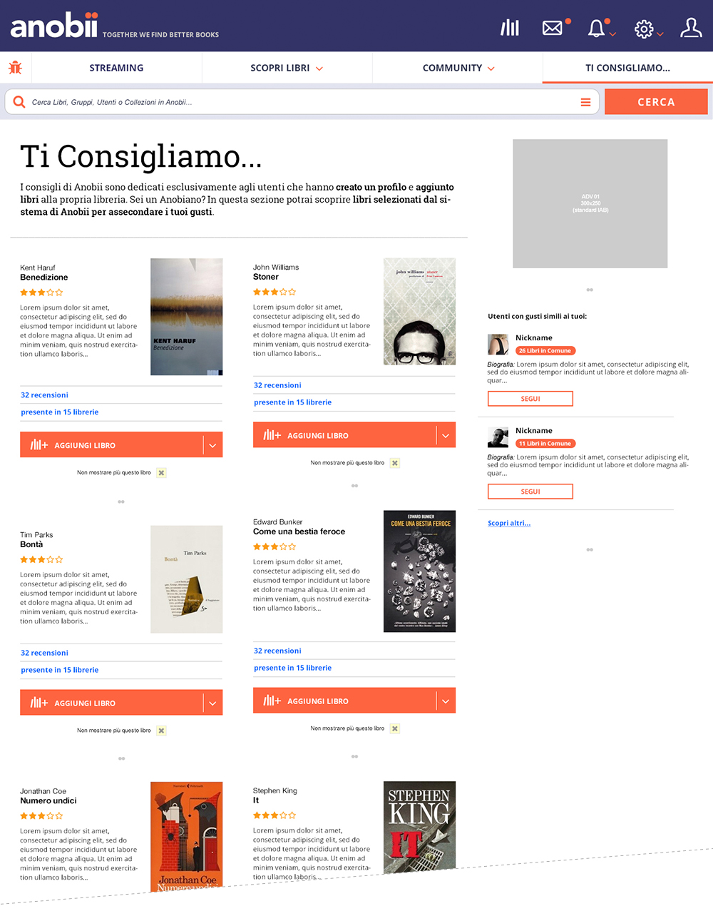 LE SUGGESTIONI BASATE SUGLI INTERESSI PERSONALI DEGLI UTENTI REGISTRATI SONO LA NOVITÀ DI CUI ANDIAMO PIÙ FIERI. UN MAGGIOR NUMERO DI LIBRI AGGIUNTI ALLA LIBRERIA E VALUTATI, SI TRADUCE IN MIGLIORI CONSIGLI DI LETTURA NELLA SEZIONE DEDICATA E IN SEGNALAZIONI DI UTENTI DAGLI STESSI INTERESSI PIÙ PRECISE.