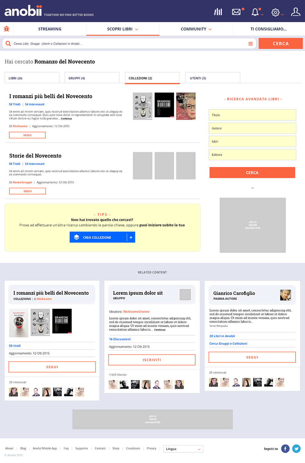 IL NUOVO AMBIENTE DI RICERCA SI ARRICCHISCE DI VISTE DEDICATE A TUTTI I CONTENUTI DEL NETWORK. EFFETTUANDO UNA SEMPLICE RICERCA DALLA BUCA PRESENTE IN TUTTE LE PAGINE, SI ATTERRA SULLA PAGINA DEI RISULTATI DOVE SI AFFIANCANO ALLA LISTA DEI LIBRI QUELLE DI GRUPPI, COLLEZIONI, UTENTI, CHE RISPONDONO ALLA RICHIESTA.